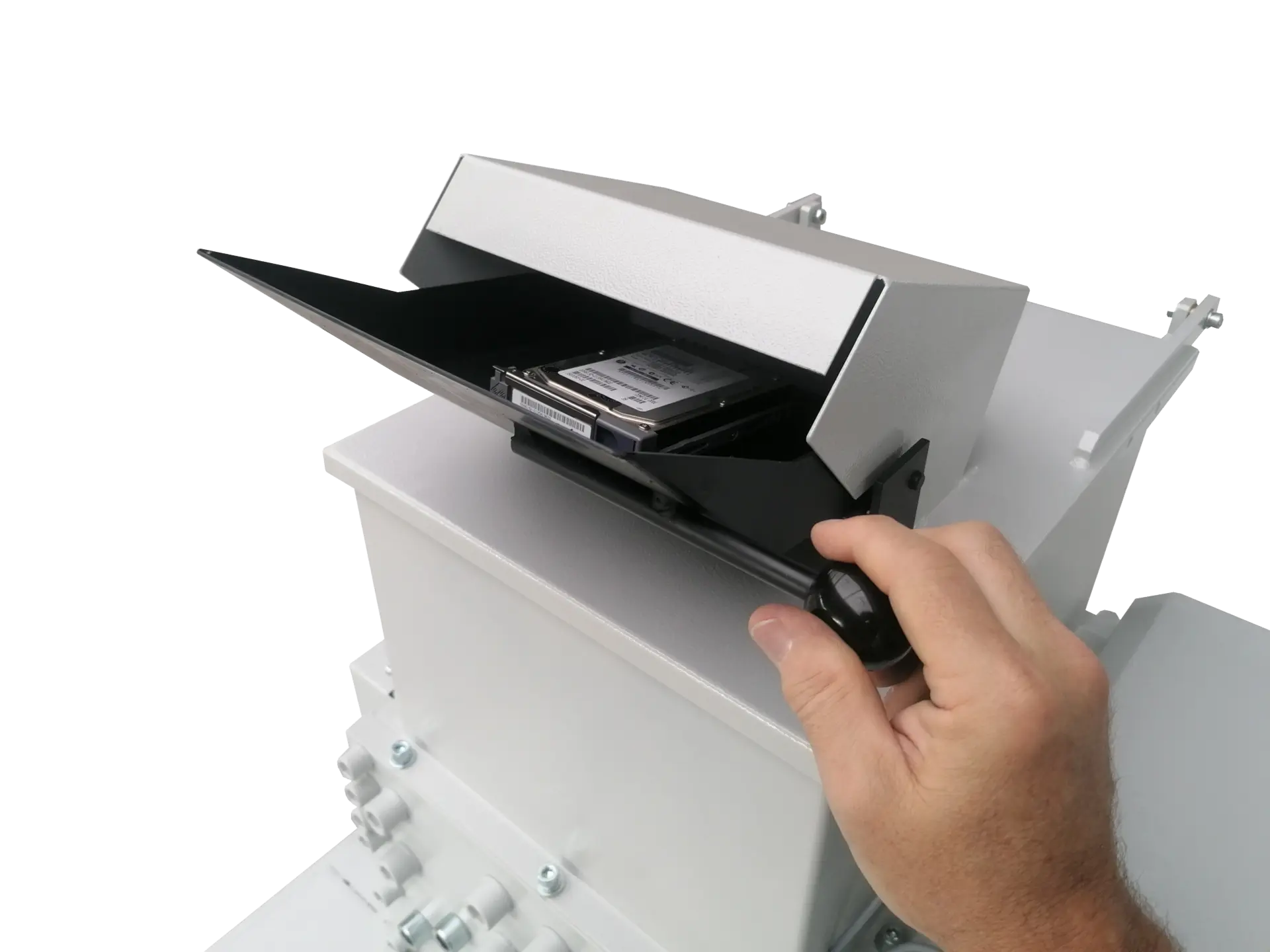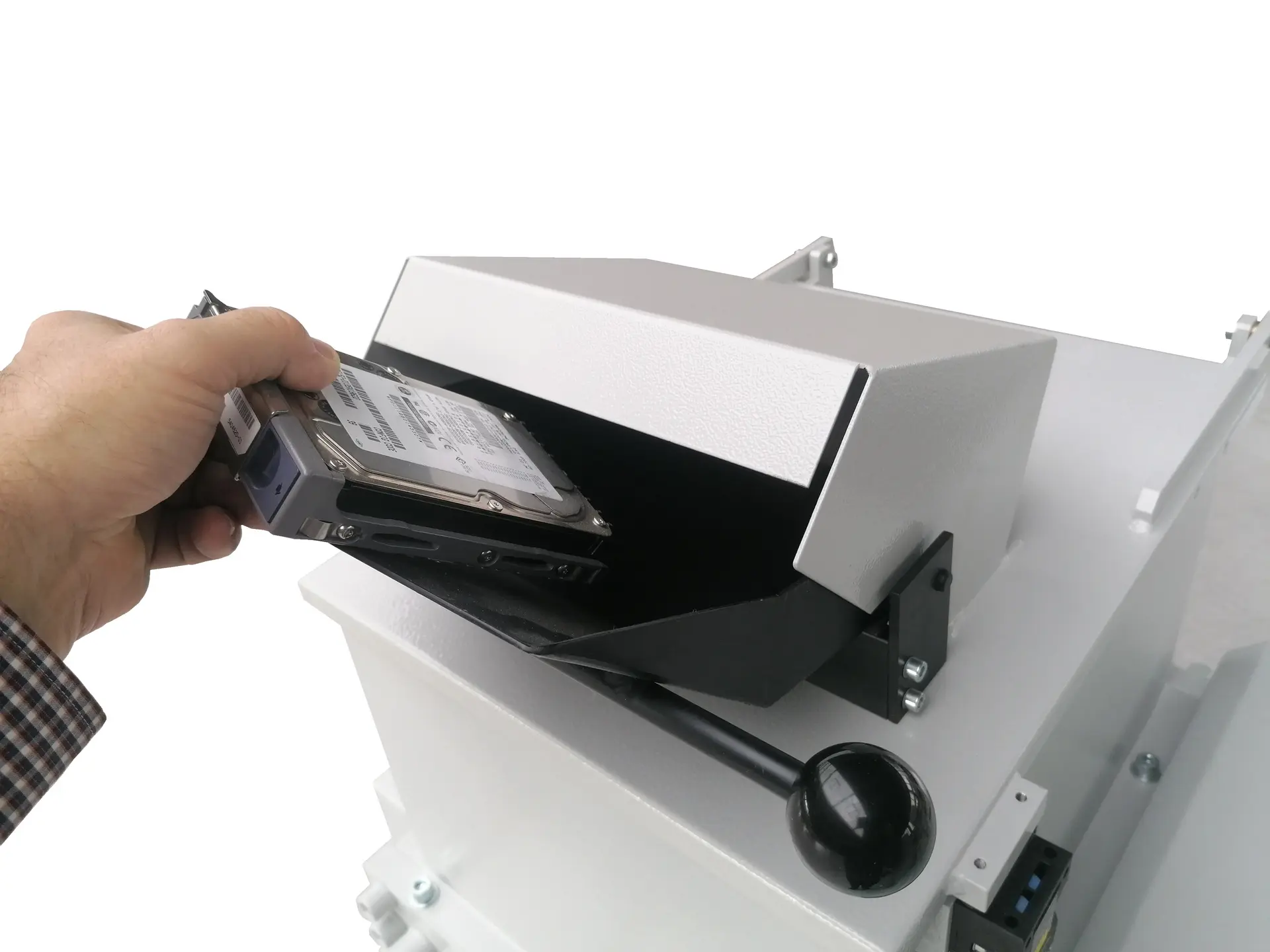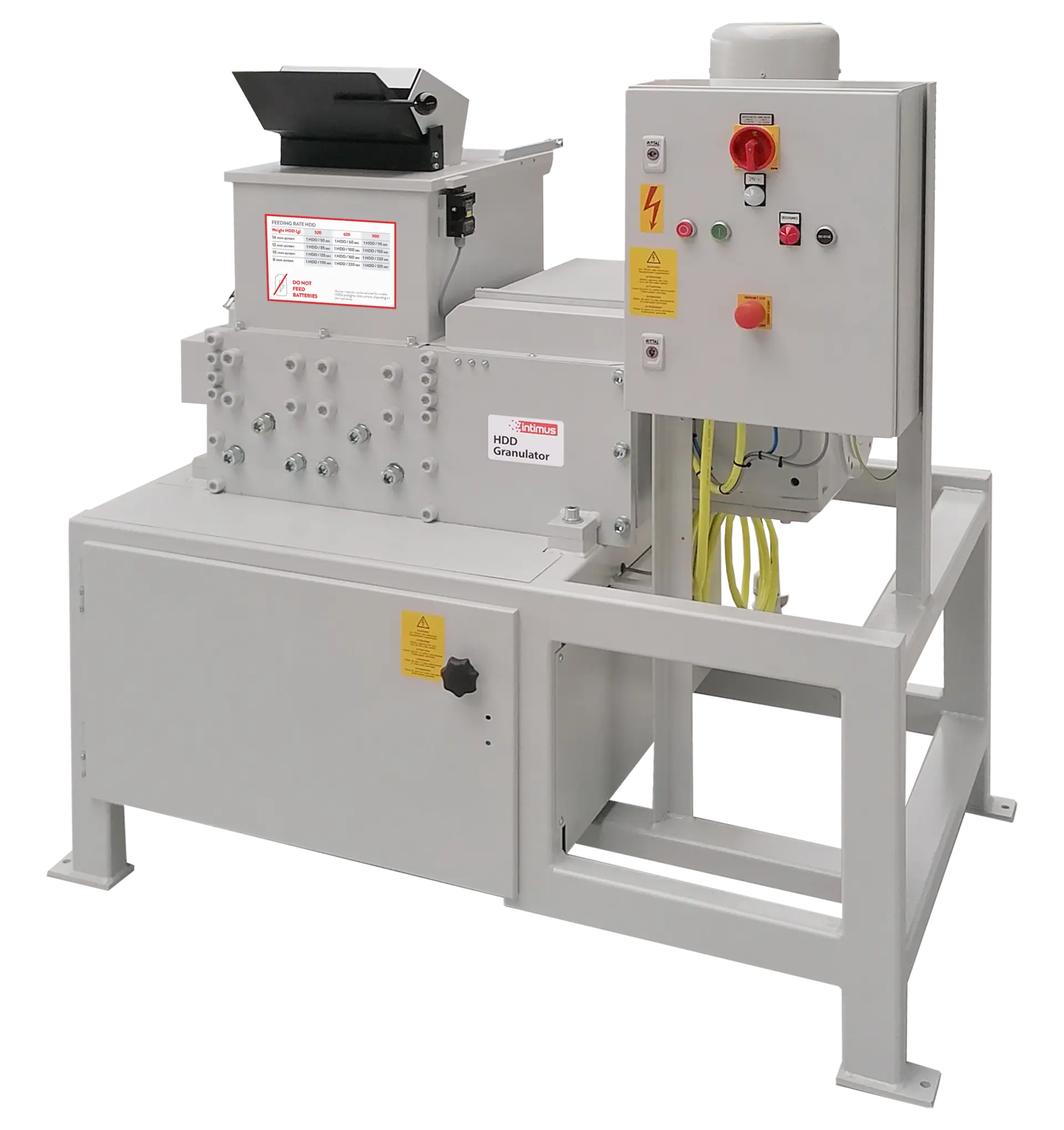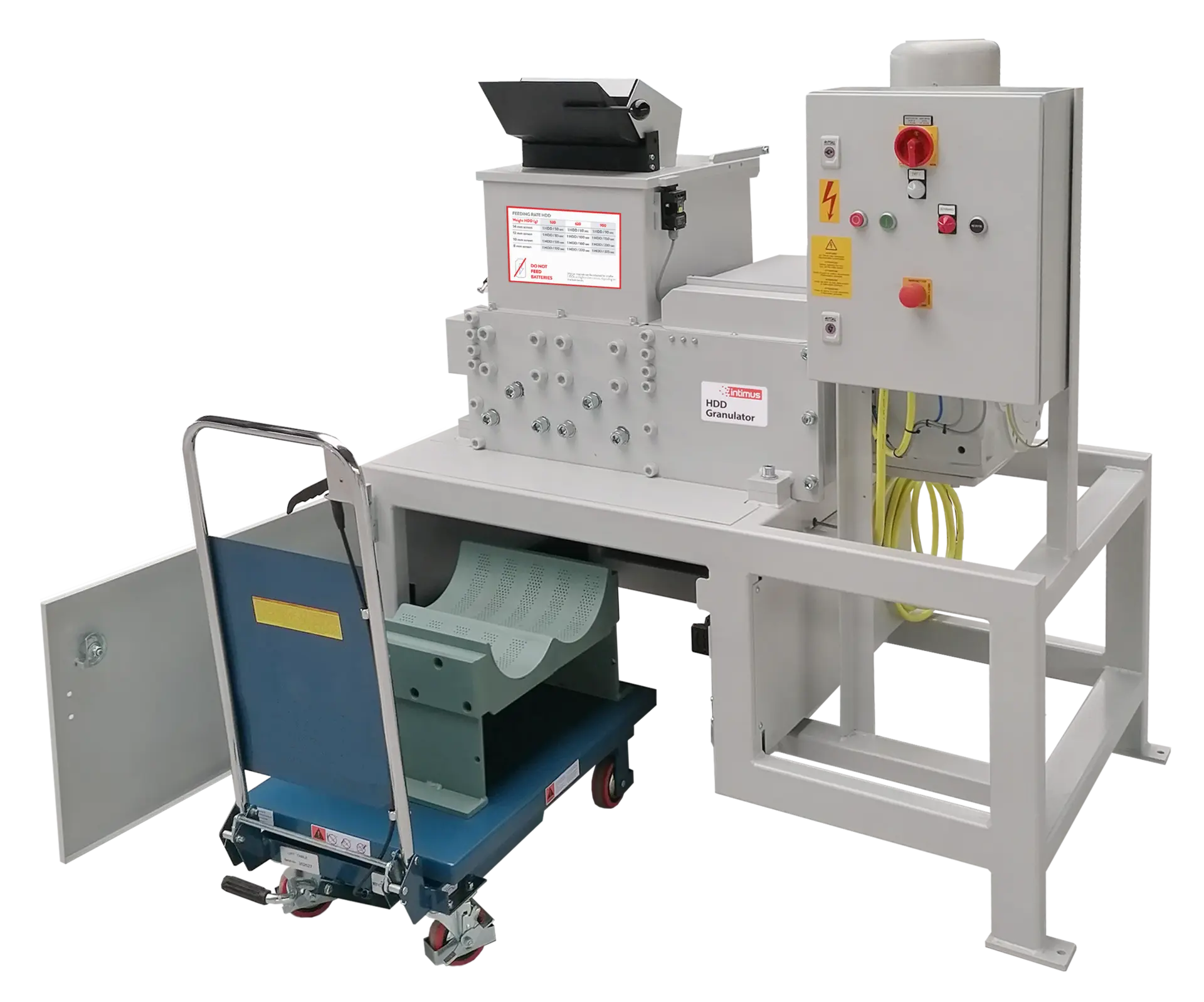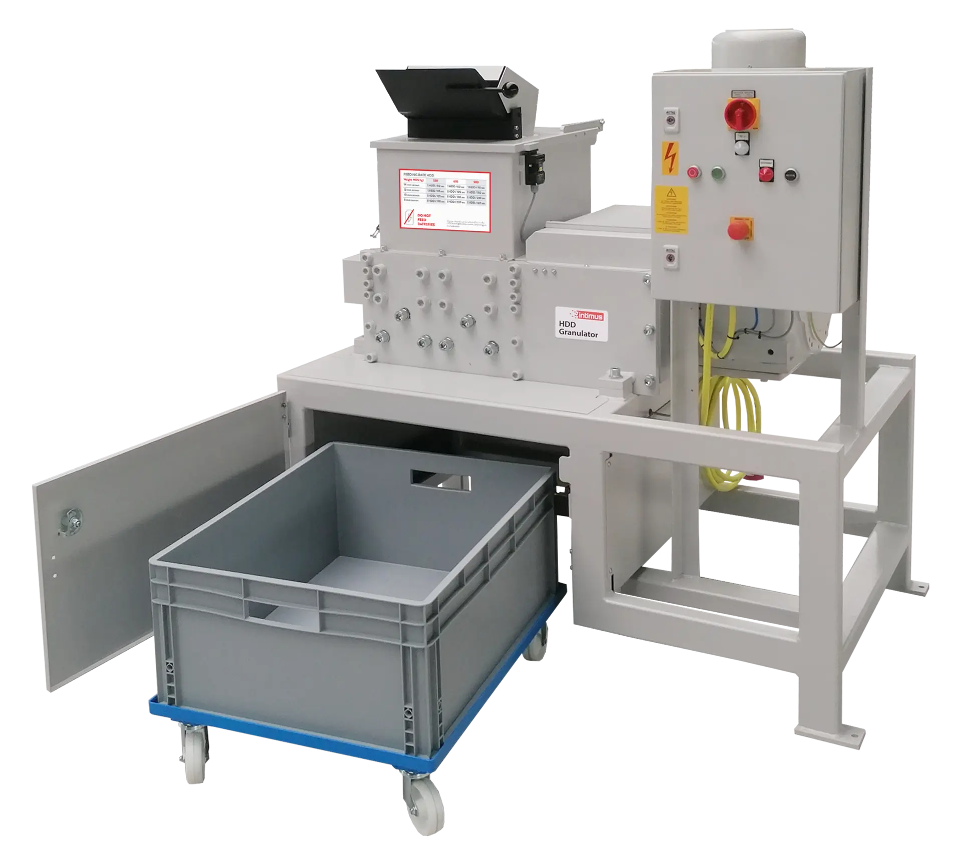 Intimus HDD Granulator hårddiskförstörare bearbetar vanliga 2,5″, 3,5″ och 5,25″ hårddiskar, videokassetter, kolfiberfilm, kretskort, CD-ROM, DDS och DLT-tape ned till 6 mm bitar.