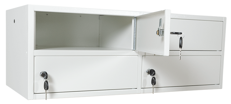 Låsbart bred 4-facksmodul med 2 st nycklar för bärbara datorer, kassalådor m.m. Elkodlås finns som tillbehör.