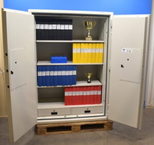 Rosengren RDC 173-2 begagnat dokumentskåp i fint skick, brandklass 120P rymmer upp till 85 pärmar. Utrustat med elektroniskt kodlås och 4 hyllplan.