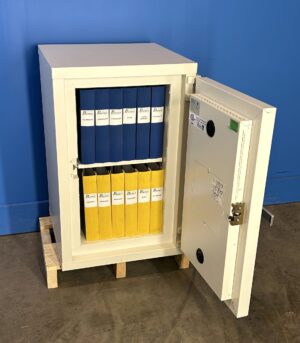 Rosengren RDC 173-2 begagnat dokumentskåp i fint skick, brandklass 120P rymmer upp till 85 pärmar. Utrustat med elektroniskt kodlås och 4 hyllplan.