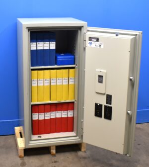 Topsafe ES 045 begagnat dokumentskåp i mycket fint skick, med brandklass 120P och är utrustat med nytt elektroniskt kodlås och utdragbar låda. Kapacitet för upp till 5 pärmar.